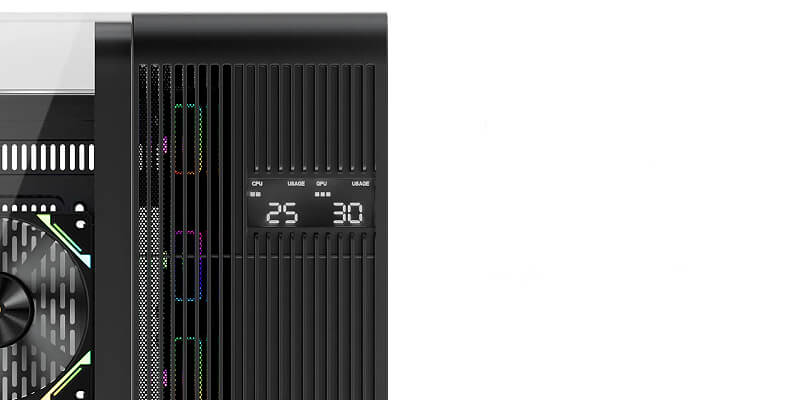 התצוגה עם תאורת LED מציגה בזמן אמת את מצב המעבד, השימוש בזיכרון, הטמפרטורה, ותדרי העבודה.