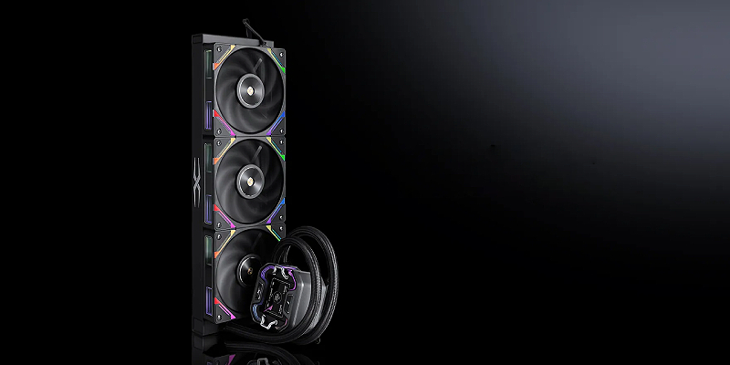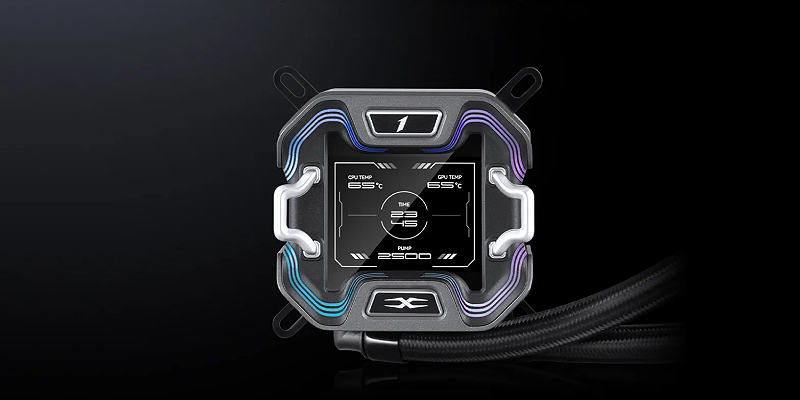 קירור נוזלי למעבד X-360 מבית 1StPlayer, בצבע שחור, עם תצוגת IPS צבעונית בגודל 2.4 אינץ' וברזולוציית 320x240 להצגת נתוני מערכת, סנכרון תאורת aRGB, תואם לתושבות Intel 1851 / 1700 / 2011 / 115x ול־AMD AM5 / AM4 להתאמה רחבה. X-360-BK