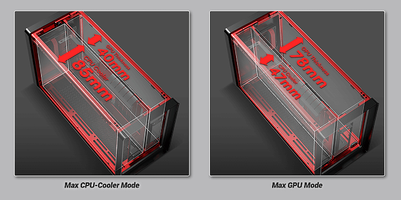 המארז כולל תושבת מרכזית מתכווננת, המאפשרת תאימות עם מגוון גדלים של GPU ו-CPU עבור גמישות רבה יותר במבנה שלך.