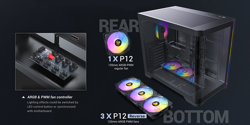 3 מאווררים הפוכים בתחתית מספקים זרימת אוויר חזקה במיוחד לתוך המארז.