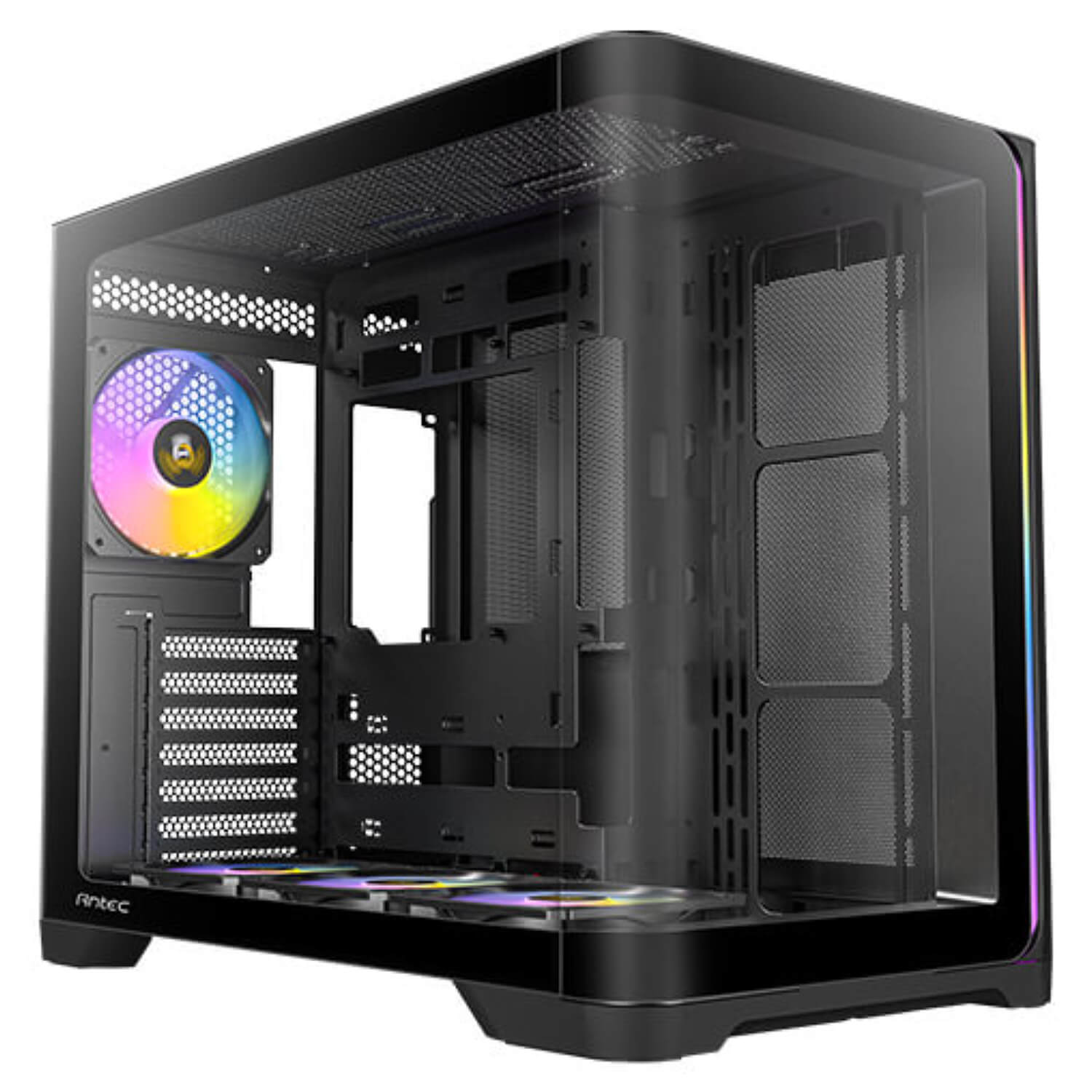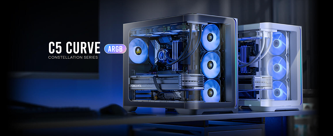 פאנלים מזכוכית מחוסמת בעיצוב קעור מציעים תצוגה פנורמית חלקה ואלגנטית, שמדגישה את מראה רכיבי המערכת שלך.