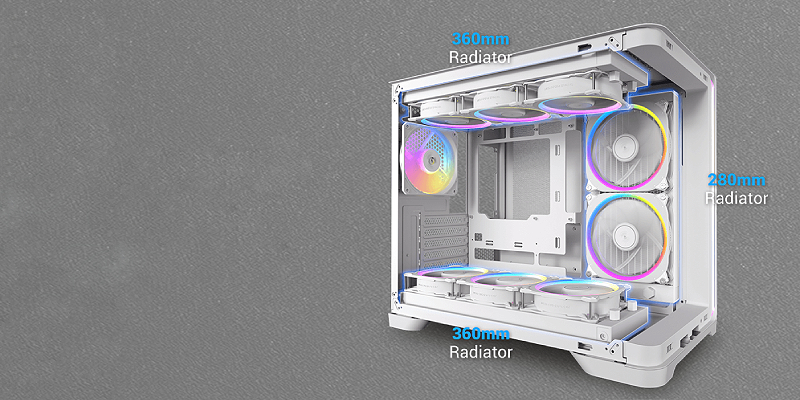 תמיכה בו־זמנית ברדיאטור עליון ותחתון בגודל 360 מ"מ, ורדיאטור צדדי בגודל 280 מ"מ.