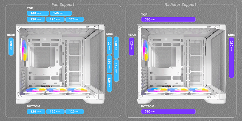 תמיכה בו־זמנית ברדיאטור עליון ותחתון בגודל 360 מ"מ, ורדיאטור צדדי בגודל 280 מ"מ.