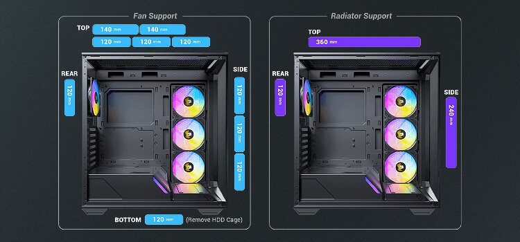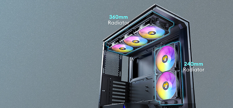 תומך בו זמנית ברדיאטור עליון בגודל 360 מ"מ ורדיאטור צדדי בגודל 240 מ"מ.
