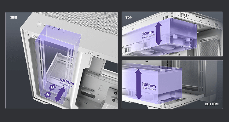 הצד העליון, התחתון והימני כולם תומכים ברדיאטורים עבים בגודל 360 מ"מ, המספקים יכולת קירור ויעילות גבוהה.