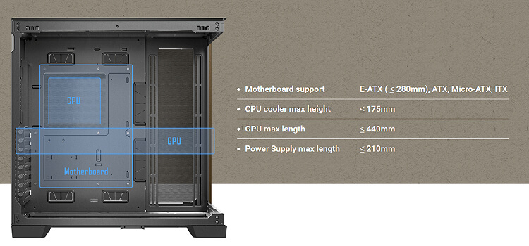 תמיכה ברדיאטורים בגודל 360 מ"מ בחלק העליון, התחתון והצד בו זמנית לקירור נוזלי.