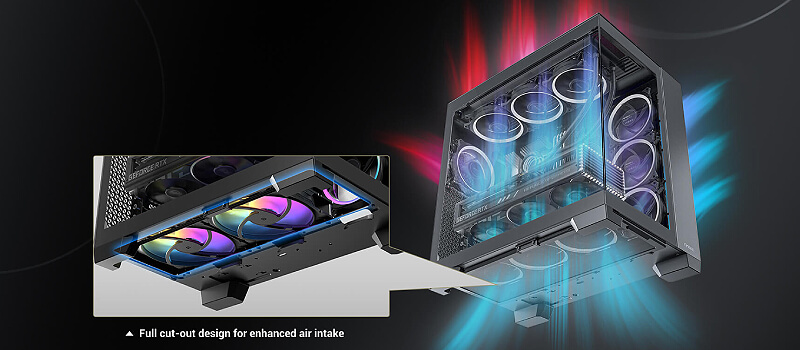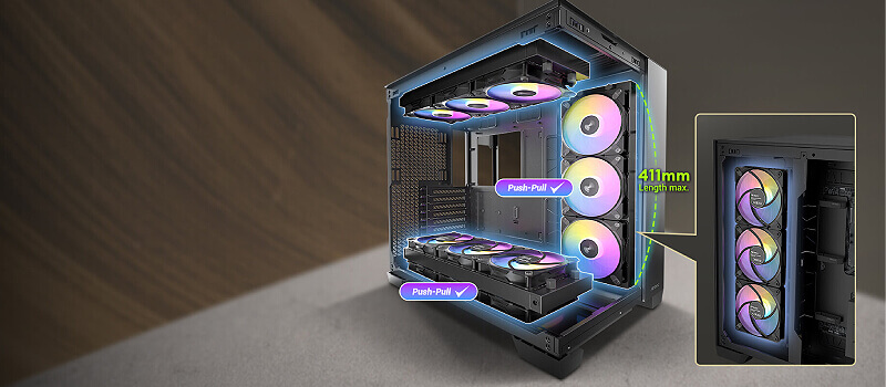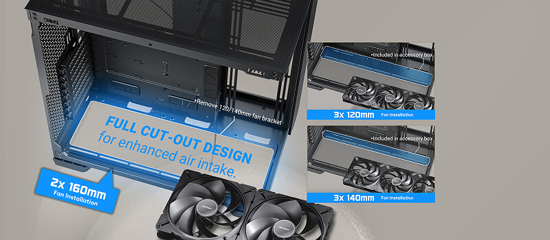 יכול להכיל שלושה מאווררים של 120 מ"מ/140 מ"מ או שני מאווררים של 160 מ"מ כל אחד, מלמעלה ולמטה לקירור יעיל.