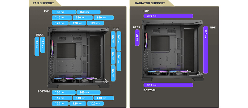 עם תמיכה ברדיאטורים של 360 מ"מ בחלק העליון, התחתון והצד בו זמנית לקירור נוזלי.