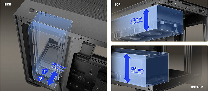 הצד העליון, התחתון והימני כולם תומכים ברדיאטורים עבים בגודל 360 מ"מ, המספקים יכולת קירור ויעילות.