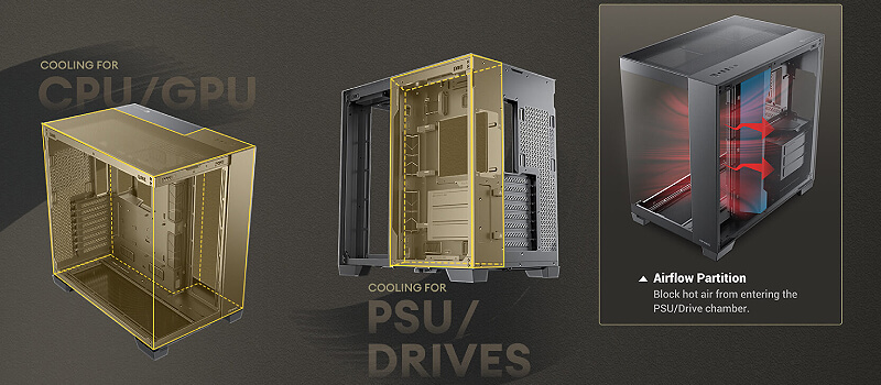 קירור עצמאי למעבד/GPU בצד שמאל ו-PSU/כוננים בצד ימין.