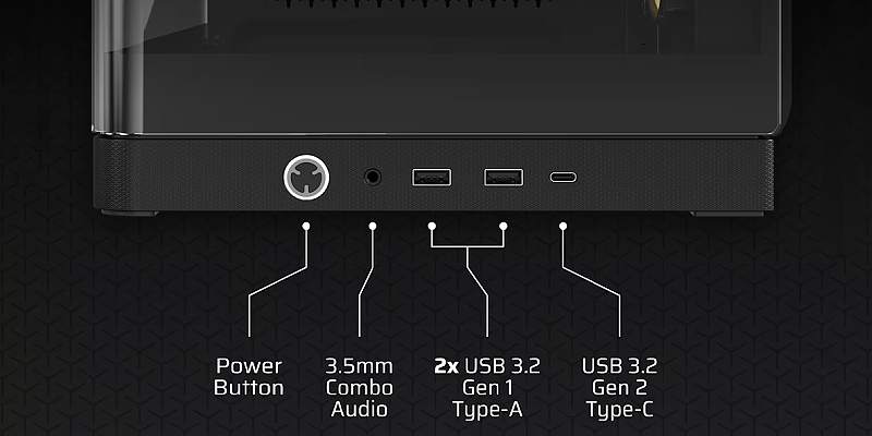 כולל חיבור USB 3.2 Gen 2 Type-C, שני חיבורי USB 3.2 Gen 1 Type-A, ושקע משולב לאוזניות/מיקרופון.