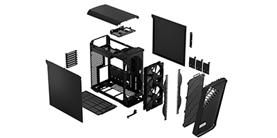 Our biggest fan Our Fractal Design 180 x 38 mm fans leverage power, size and thickness for massive air-moving capacity. Front fan brackets allow for unblocked airflow to the larger fans while catering to standard radiator sizes Dust filters for front and bottom easily accessible by removing the front |