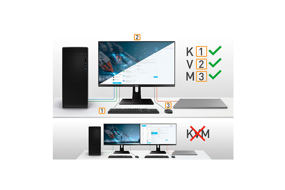 צג עם מתג KVM מאפשר לך לשתף את ההתקנים המחוברים באמצעות USB לצג שלך עם שני מחשבים שונים. פשוט שנה את כניסת האות בתפריט ה-OSD של הצג והמקלדת, העכבר ומצלמת האינטרנט שלך יעברו מהמחשב הנייד של העבודה שלך למחשב המשחקים שלך.