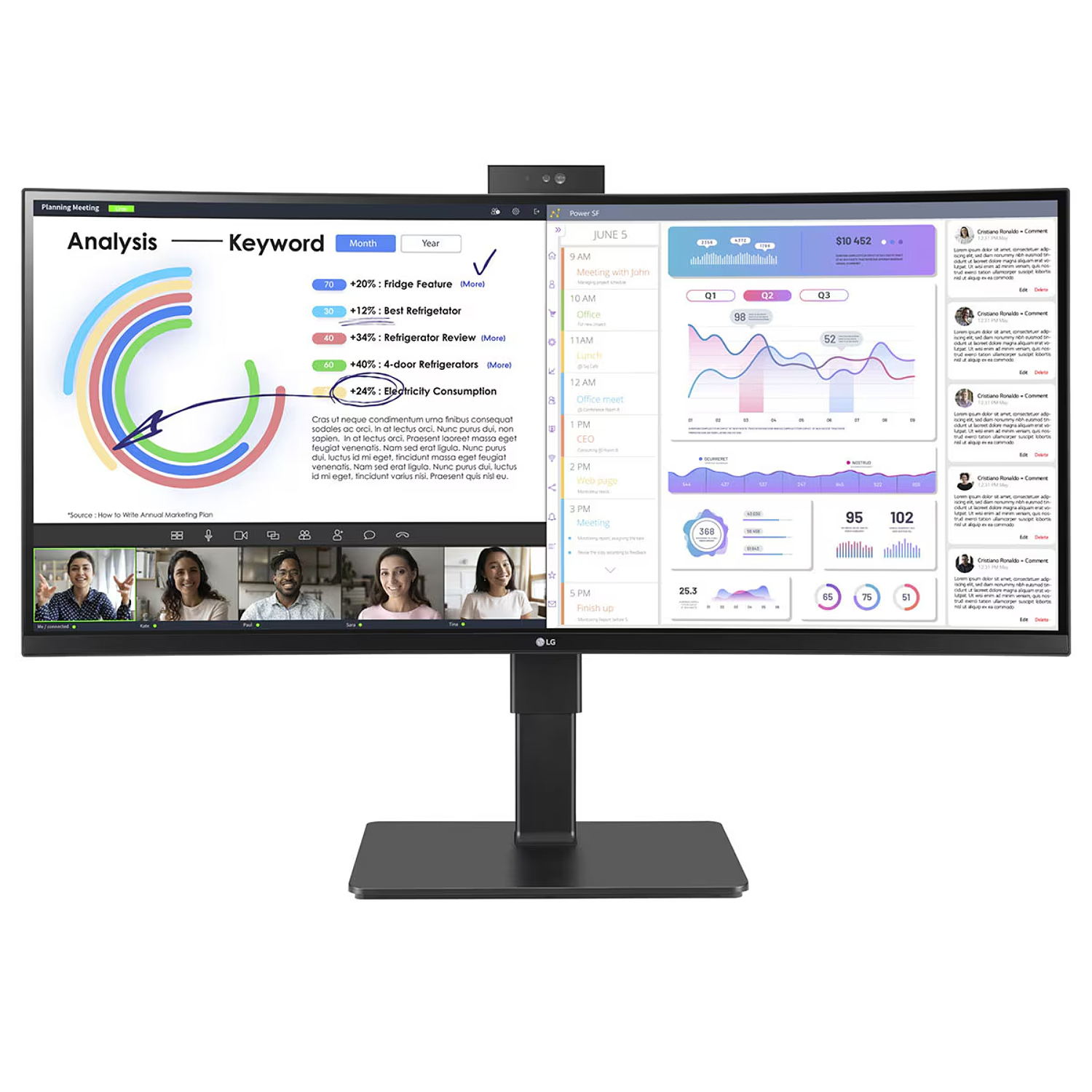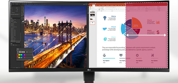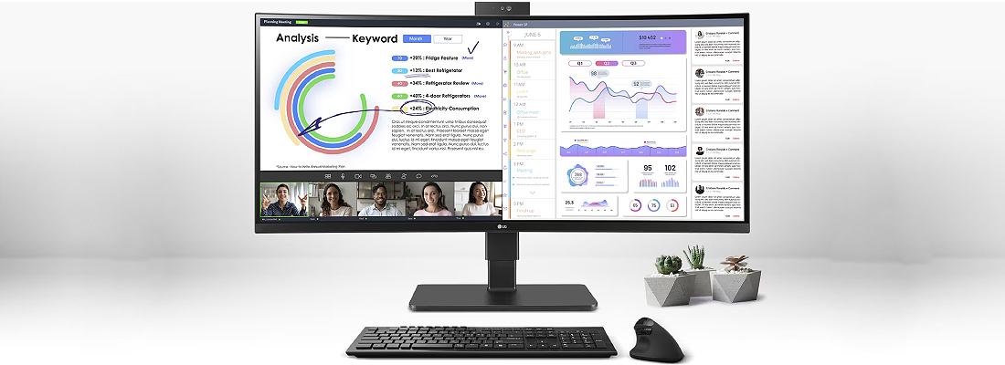 מסך LG WQHD (3440x1440) עם טכנולוגיית IPS מספק תמונות חדות וצבע חי ובולט תוך מתן מרחב עבודה גדול לריבוי משימות.