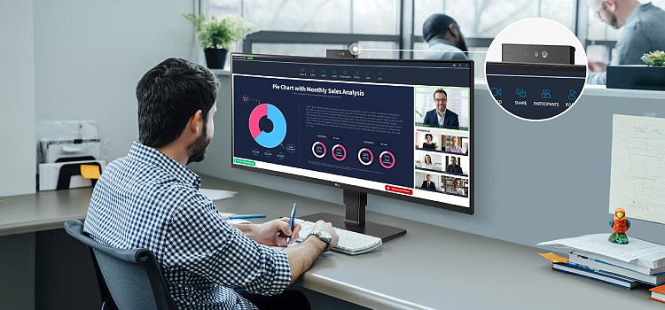 מסך UltraWide™ Curved QHD (ברזולוציית 3440x1440, עם יחס רוחב-גובה של 21:9) מצוין לעבודה.