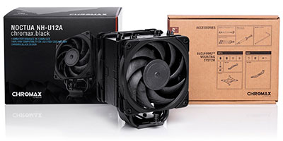 | The NH-U12A chromax.black is an all-black version of Noctua’s award-winning NH-U12A premium-quality quiet CPU cooler. Thanks to the same proven asymmetrical single-tower heatsink design and state-of-the-art NF-A12x25 PWM fans, it stays true to the NH-U12A’s successful formula of fusing best-in-class cooling performance with superb quietness of operation and outstanding RAM, case and PCIe compatibility. | ![]() |