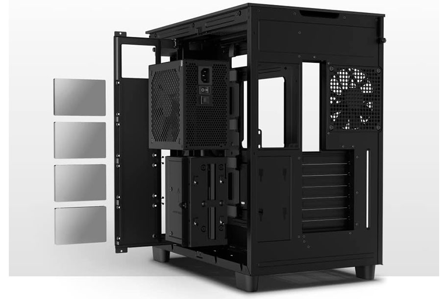 Spacious interior with intuitive cable management, a dedicated SSD wall panel, and removable top and side mounting brackets.