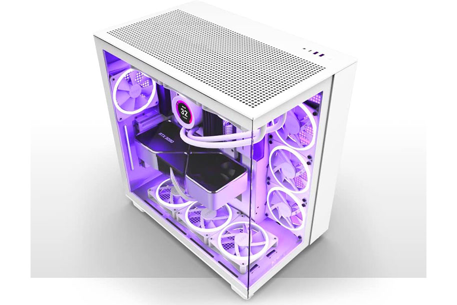 NZXT H9 Flow White is designed to cool off powerful GPUs with its expansive thermal capabilities, featuring the capacity for ten fans and numerous 360mm radiator mounting options and the perforated top panel takes cooling even further. Includes 4x F120Q Quiet Airflow Fans! CM-H91FW-01