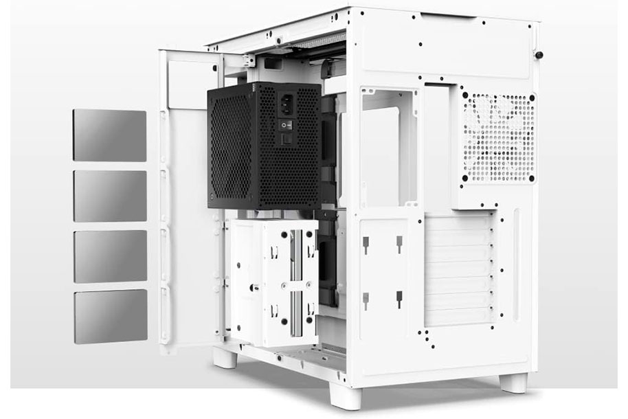 Spacious interior with intuitive cable management, a dedicated SSD wall panel, and removable top and side mounting brackets.