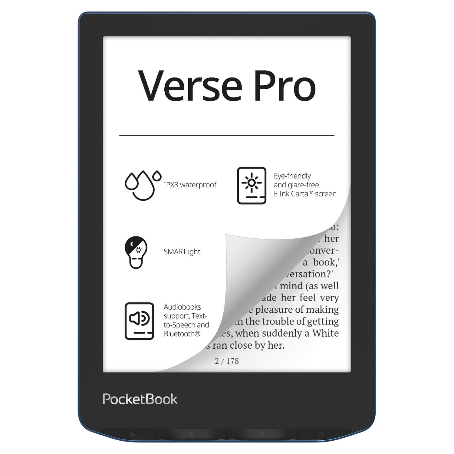 ספר אלקטרוני Verse Pro PB634-A-WW מבית PocketBook בצבע כחול, עם מסך בגודל 6 אינץ', Bluetooth, תכונת SMARTlight להתאמת גוון חם או קר, תכונת Text-to-Speech, עמידות במים בתקן IPX8 וחיבור Wi-Fi. תמיכה בשפות - עברית / אנגלית / ערבית / רוסית / אוקראינית.