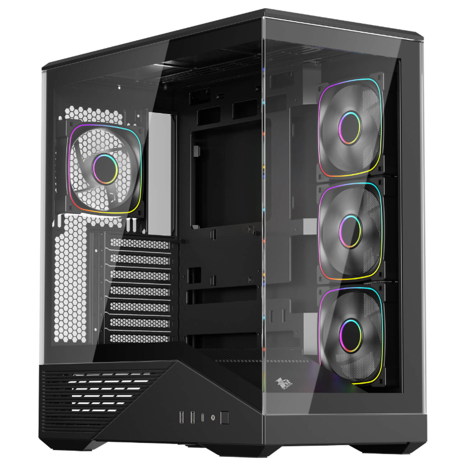 מארז מחשב GM7 מבית 1StPlayer, בצבע בצבע שחור אלגנטי עם מראה מינימליסטי, מגיע עם 4 מאוררי ARGB מותקנים מראש. GM7-BK-3FN7R-1FN7