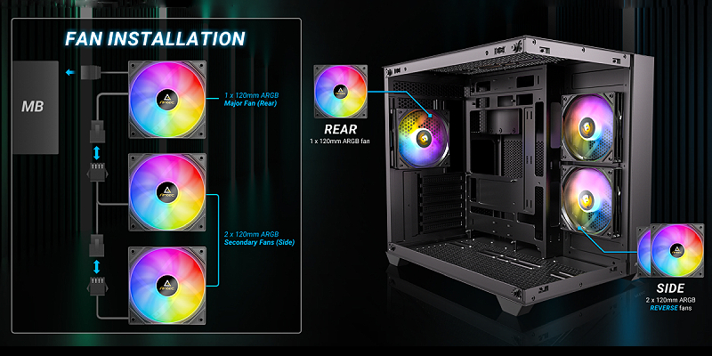 Included ARGB Fans Rear 1x120mm & Reverse on right side 2x120mm