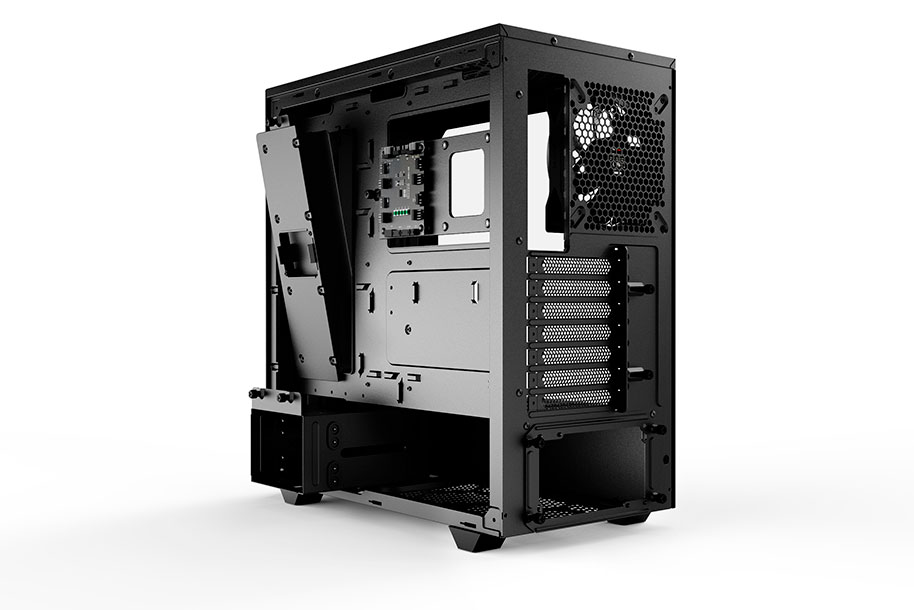 Pure Base 500 FX Black offers various options for installing up to 4 SSDs in total. 2 can be installed for prominent viewing through the window panel. To hide any unwanted cables, the case offers excellent cable routing options.