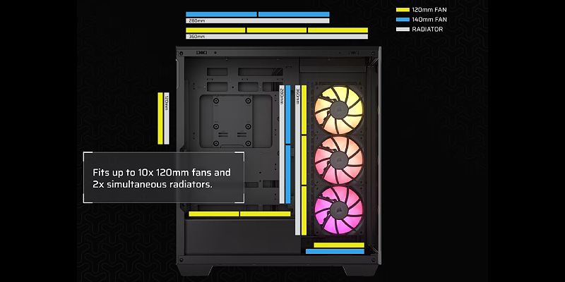 התאם אישית את מערך הקירור שלך עם מקום ל-10 מאווררים בגודל של עד 120 מ"מ, בתוספת אפשרויות מגוונות להרכבה של רדיאטור עד 360 מ"מ בצד ובגג.