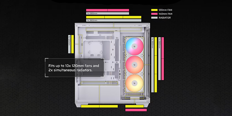 התאם אישית את מערך הקירור שלך עם מקום לעד 10 מאווררי 120 מ״מ, בתוספת אפשרויות מגוונות להתקנת רדיאטורים – כולל עד 360 מ״מ בצד ובגג.