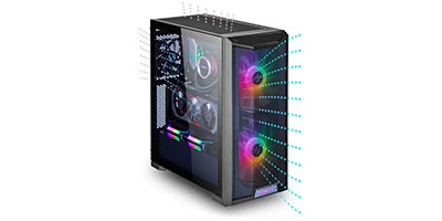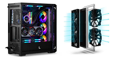 Ultimate cooling system scenario With two 200MM fans mounted outside of the frame, you still have enough room to front mount a 360 AIO radiator to benefit from the ultimate cooling scenario. Don’t worry about the fan screws, they won’t interfere with the radiator. |
