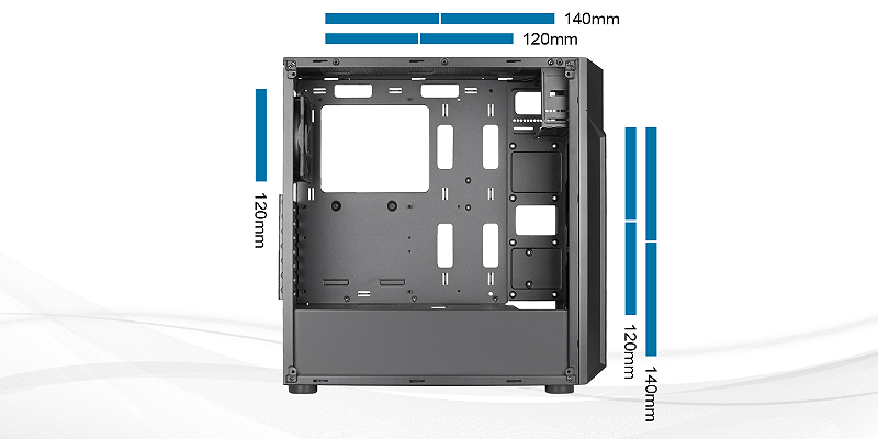 לוח קדמי גדול מפלדת רשת עם תושבות למאווררים בגודל 2x120 מ"מ או 2x140 מ"מ מספק כניסת אוויר חופשית למערכת.