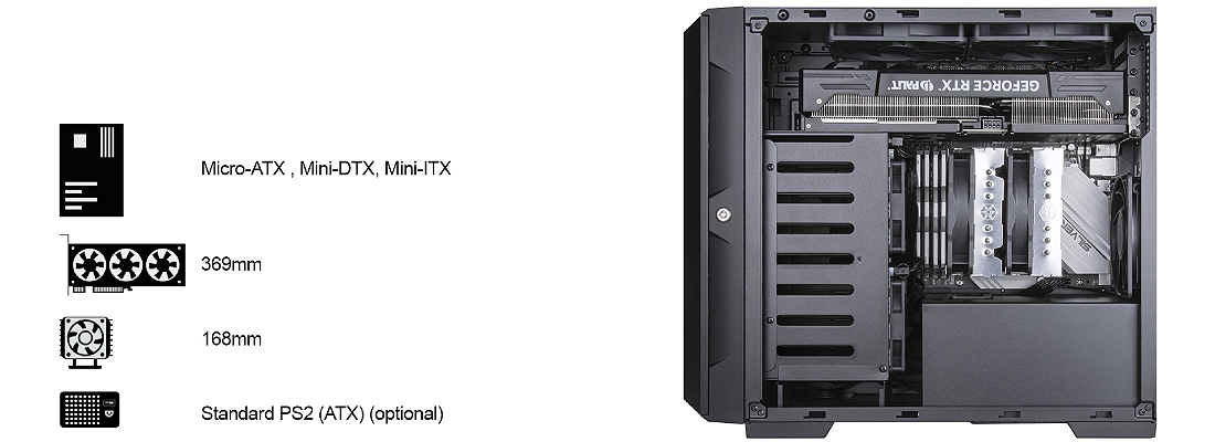 Supports Micro-ATX motherboard and ATX (PS2) power supply.