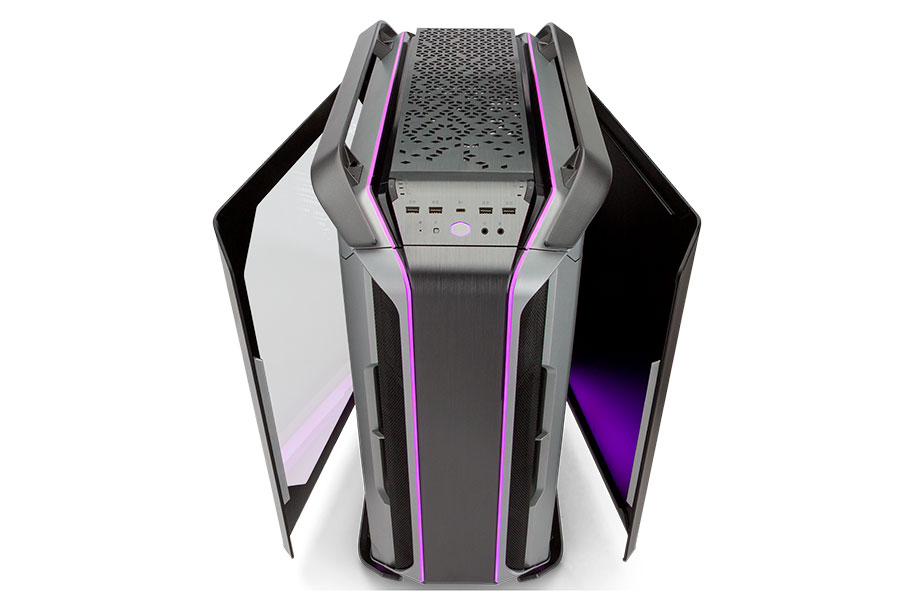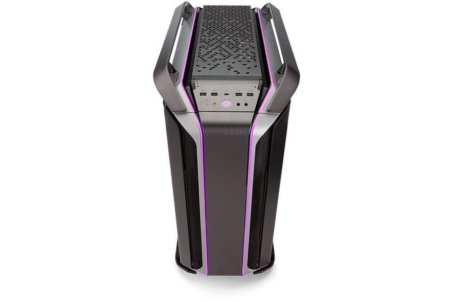 A panoramic tempered glass side panel, with two curved edges, offer a wide view of the system build.