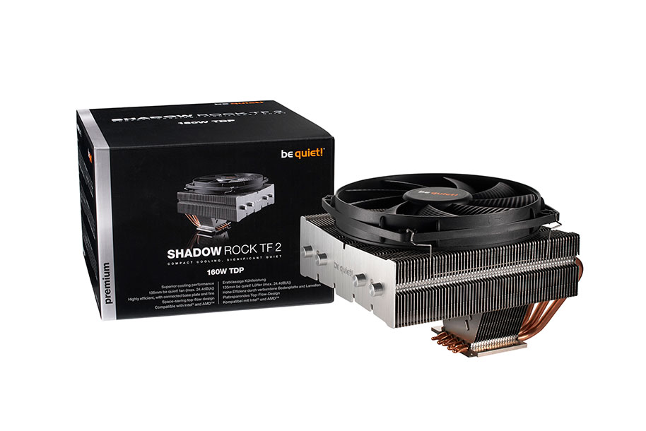 Shadow Rock TF 2 is equipped with five 6mm heat pipes. They carry the heat straight to optimal locations on the cooling fins and provide the system with a remarkable compact cooling capacity of 160W TDP.