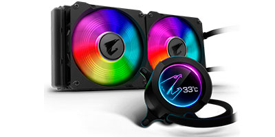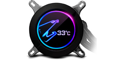 | New high performance pump efficiently dissipates heat from high end CPUs. Unique 60*60mm circular full color LCD with dynamic AORUS logo display designs and custom a picture and text available. High performance, low-noise level, dual ball bearing ARGB fans. Supports RGB FUSION 2.0 synchronization with other AORUS devices. Universal design for fan & pump RPM control, supports all MB brands. |