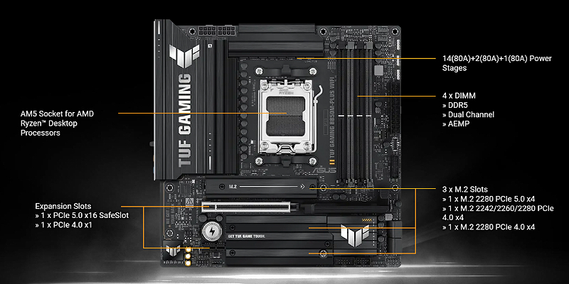 ה-ASUS TUF GAMING B850M-PLUS WIFI לוקח את כל המרכיבים החיוניים של מעבדי AMD Ryzen™ העדכניים ביותר ומשלב אותם עם תכונות מוכנות למשחק ועמידות מוכחת.