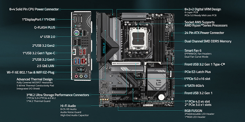 Dual Channel DDR5 – ארבעה חריצי DIMM מסוג SMD עם תמיכה בזיכרונות AMD EXPO™ ו-Intel® XMP.