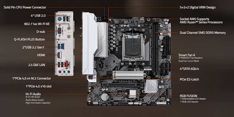 Gigabyte B650M GAMING WIFI6E, Supports AMD Ryzen 7000 / Ryzen 8000 / Ryzen 9000 Series Processors. Unparalleled Performance 5+2+2 Phases Digital VRM Solution. GB650MGAMINGWIFI6E