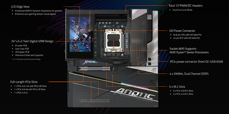 • 5" LCD Edge View : תצוגה דינמית בזמן אמת של AORUS עם עיצוב קצוות ייחודי, המספקת מידע מיידי על המערכת