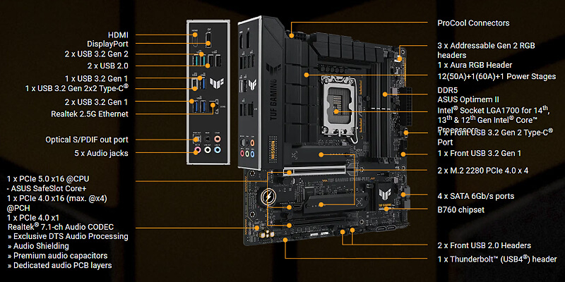 לוח האם TUF GAMING B760M-PLUS מאחד את כל המרכיבים החיוניים של מעבדי Intel העדכניים עם תכונות גיימינג מתקדמות ועמידות מוכחת.