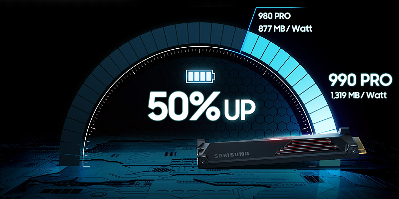 ביצועים גבוהים יותר צורכים בדרך כלל יותר חשמל, אך ה-990 PRO משתמש בפחות חשמל עם ביצועים משופרים של עד 50% לוואט על פני 980 PRO.