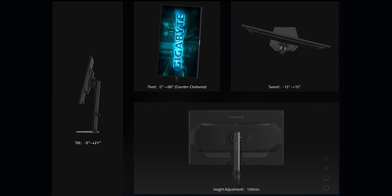 מסך הגיימינג של GIGABYTE כולל מעמד בלעדי בעל עיצוב ארגונומי, המאפשר טווח רחב של כוונון גובה ונטייה.