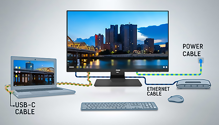 תחנת העגינה מאפשרת לך לחבר את המחשב הנייד שלך עם כבל בודד למסך כדי לוודא שהוא טעון ומחובר לרשת הקווית ושהאות מהמחשב הנייד נשלחת לצג.