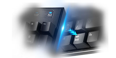 The Win-lock key with independent indicator allows you to disable the Windows key and prevent accidental activation of the Windows Start function during gaming session.