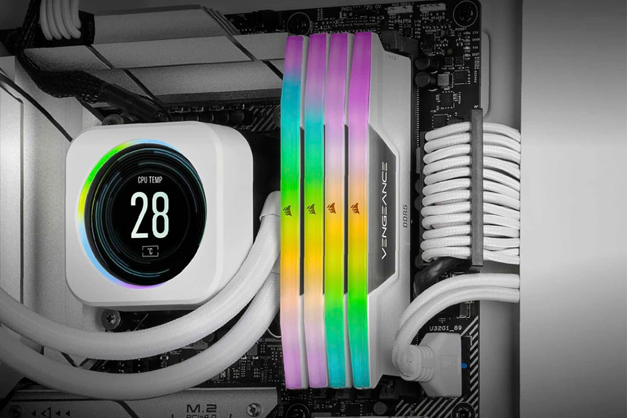 Corsair DDR5 32G (2x16G) 6400 CL36 Vengeance RGB CMH32GX5M2B6400C36W. Memory delivers DDR5 performance, higher frequencies, and greater capacities optimized for Intel motherboards while lighting up your PC with dynamic, individually addressable ten-zone RGB lighting.