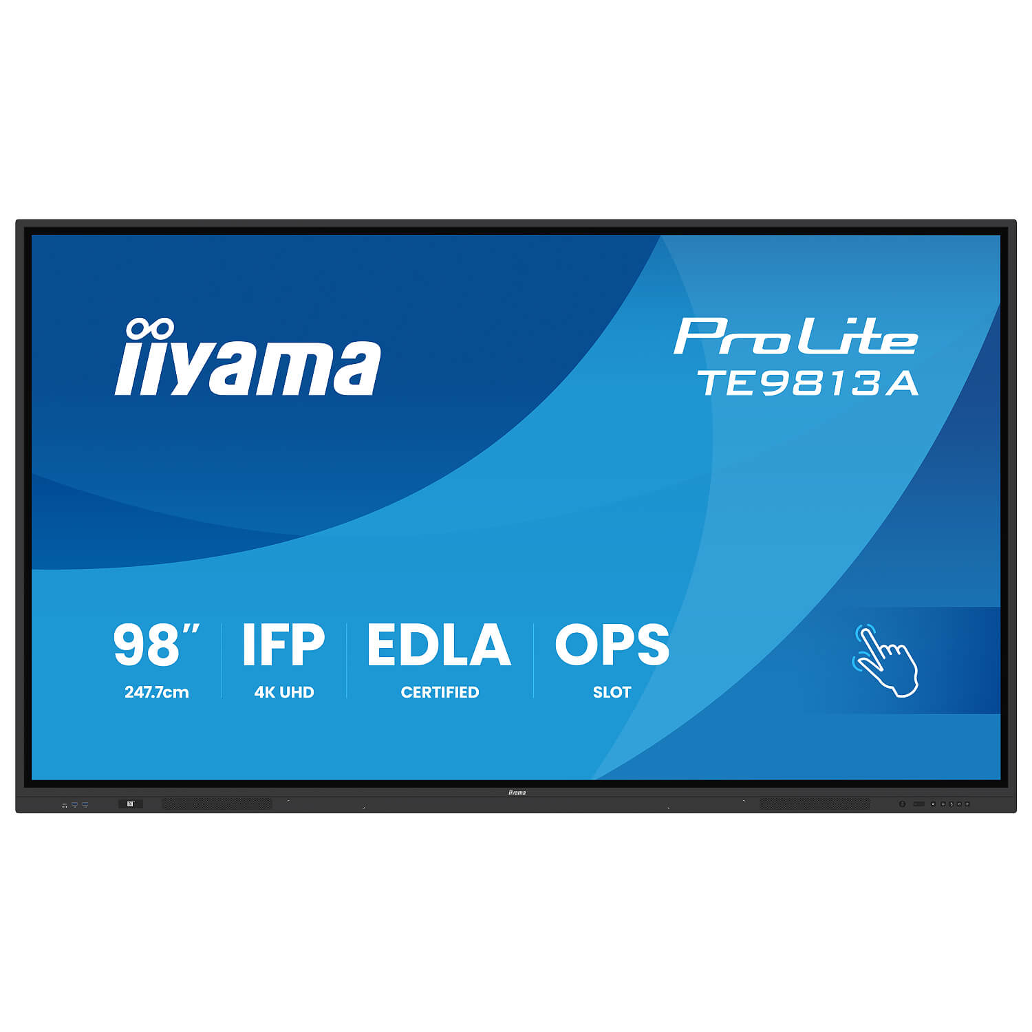 מסך מגע אינטראקטיבי ProLite TE9813A-B1AG מבית IIYAMA בגודל 98 אינץ', עם פאנל IPS ברזולוציית 4K UHD, טכנולוגיית מגע +PureTouch-IR עם 40 נקודות מגע, תוכנת iiWare 21E עם Android 14-EDLA, קישוריות WiFi-6 ו-Bluetooth 5.0, ומערכת ניהול iiControl (DMS), מגיע עם מתקן תלייה, מעמד למצלמת רשת ו-4 עטים למסך מגע.