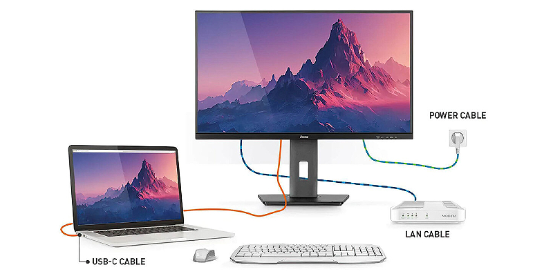 תחנת העגינה USB-C מספקת סביבת עבודה נקייה ויעילה באמצעות כבל יחיד, המעביר את אות התצוגה מהמחשב הנייד למסך ובמקביל מספק טעינה והספק למחשב ישירות מהמסך.