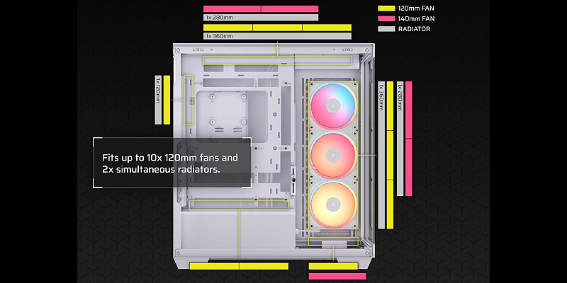 התאם אישית את מערך הקירור שלך עם מקום לעד 10 מאווררים בגודל 120 מ"מ, וכן אפשרויות התקנת רדיאטורים גמישות, כולל עד 360 מ"מ בצד ובגג.