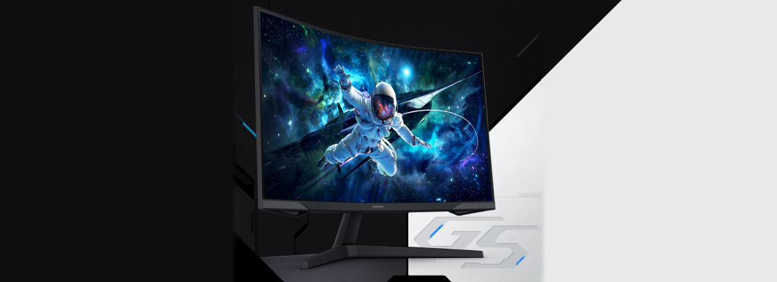 מסך מחשב קעור לגיימינג Odyssey G5 מבית Samsung בגודל 27 אינץ' עם קימור ברדיוס 1000R, פאנל VA ברזולוציית QHD עם קצב ריענון של 165Hz, זמן תגובה של 1ms וטכנולוגיית AMD Radeon FreeSync.