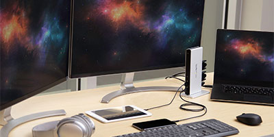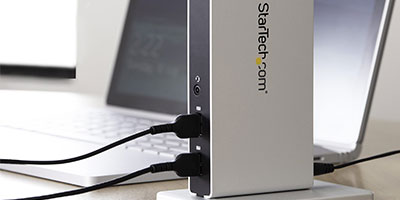 | Display Flexibility The dual-DVI docking station adds dual-monitor support to your workstation, with resolution support up to 2048x1152. With more screen space, you can simultaneously access multiple applications and reference material on one display while composing on the other. To ensure the USB 3.0 dock supports a variety of displays, two display adapters (DVI to VGA and DVI to HDMI) are included. |